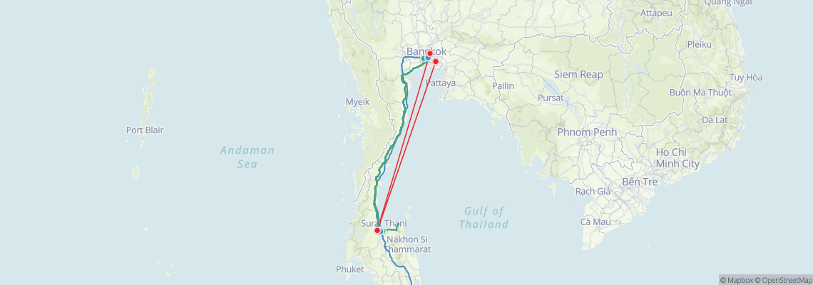 The travel distance between Bangkok and Surat Thani is 644 km. There are three options to travel from Bangkok to Surat Thani: taking a flight, a train or a bus.
