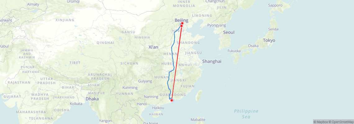 The travel distance between Beijing and Shenzhen is 2,176 km. There are two options to travel from Beijing to Shenzhen: taking a flight or taking a train.