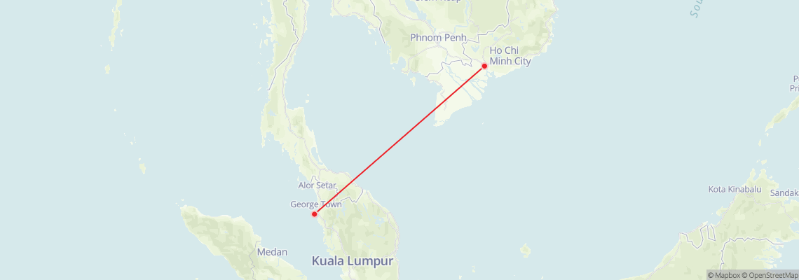 The travel distance between Ho Chi Minh and Penang is 931 km. The best option to travel from Ho Chi Minh to Penang is taking a flight.