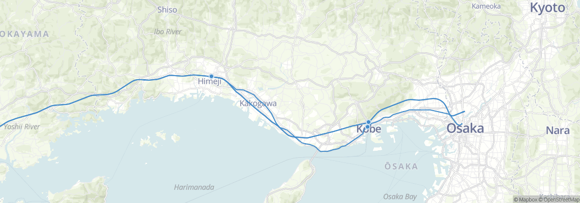 It takes about 15 minutes to 50 minutes to get from Kobe to Himeji by train, depending on the service.
