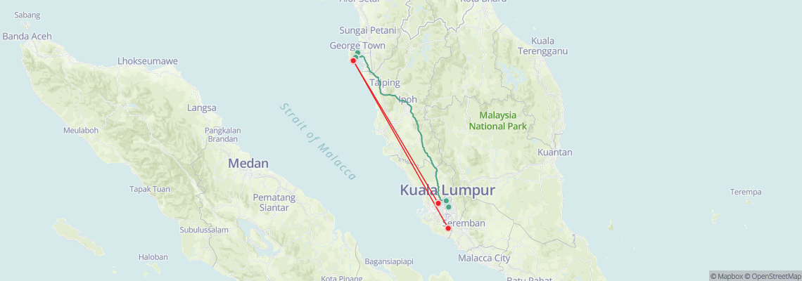 The travel distance between Penang and Kuala Lumpur is 293 km. There are two options to travel from Penang to Kuala Lumpur: taking a flight or a bus.