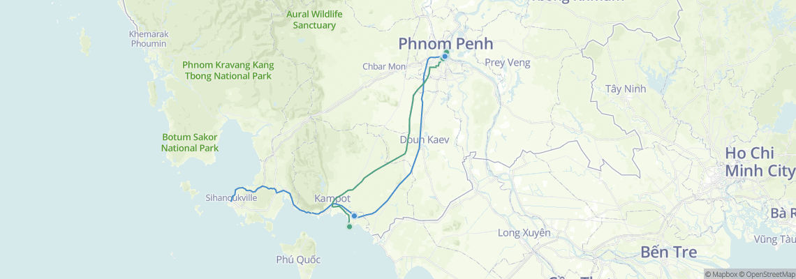 The travel distance between Phnom Penh and Krong Kep is 167 km. There are two options to travel from Phnom Penh to Krong Kep: taking a train or a bus.