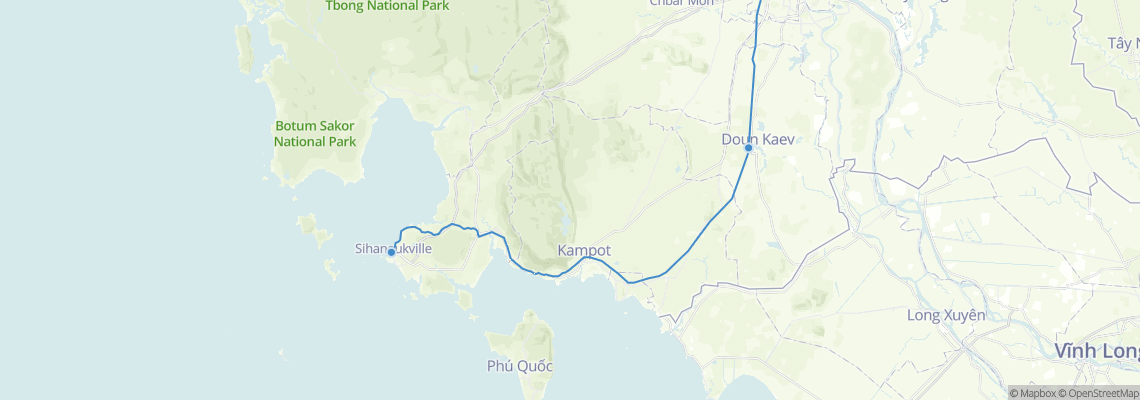 The travel distance between Sihanoukville and Takeo is 190 km. The best option to travel from Sihanoukville to Takeo is taking a train.