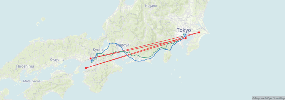 The travel distance between Tokyo and Osaka is 500 km. There are three options to travel from Tokyo to Osaka: taking a flight, a train or a bus.