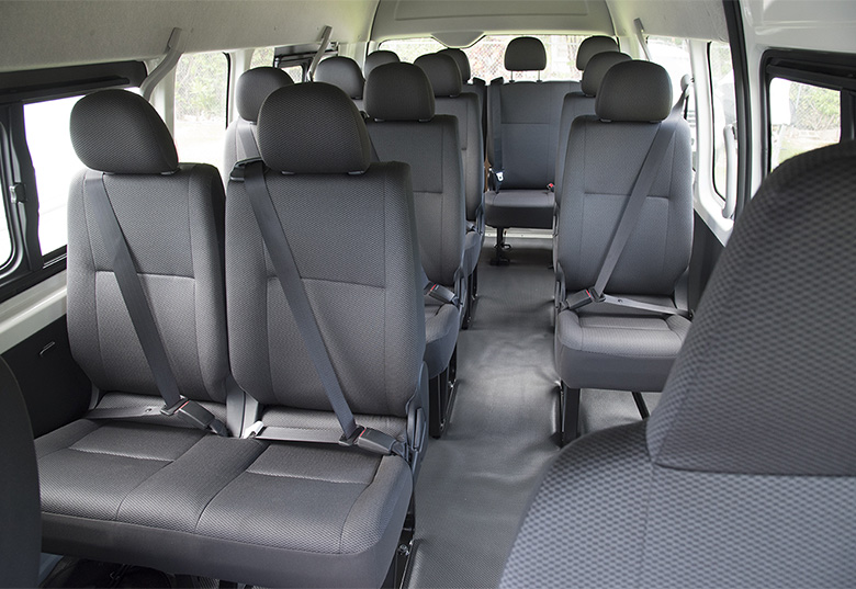 Los modelos más comunes de furgonetas son Toyota Hiace, con el interior adaptado para tres filas de asientos con capacidad para 10 a 15 pasajeros.