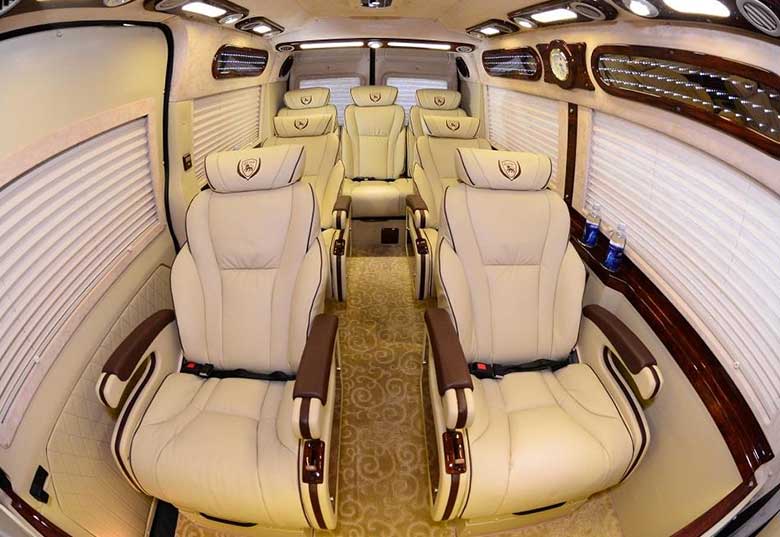Los modelos más comunes de furgonetas son Hyundai Solati y Ford Transit, con el interior adaptado para tres filas de asientos con capacidad para 10 a 15 pasajeros.
