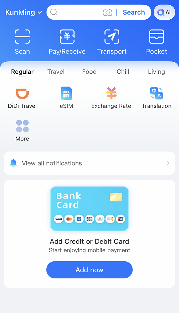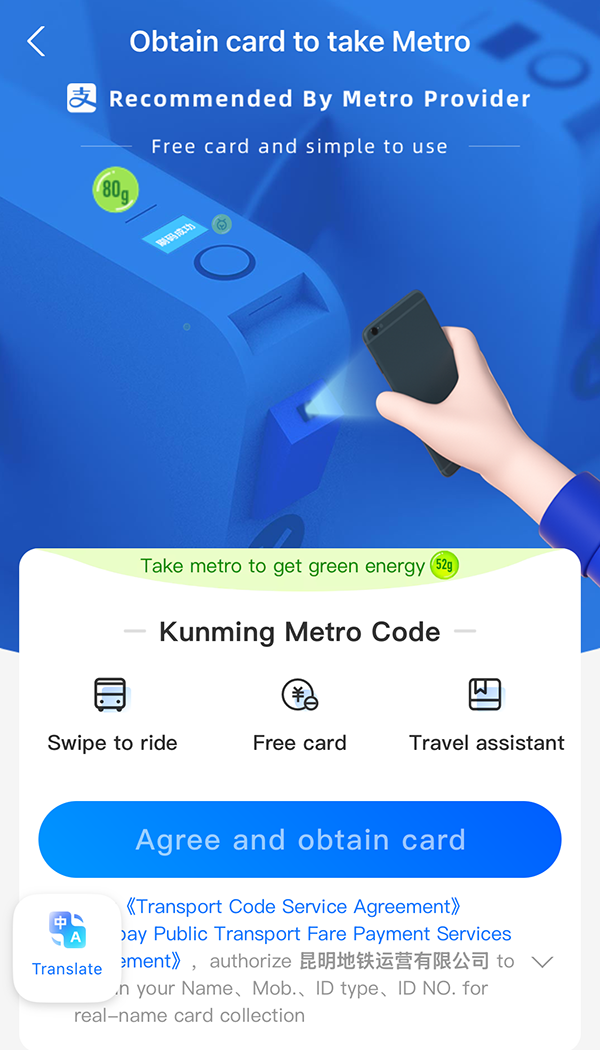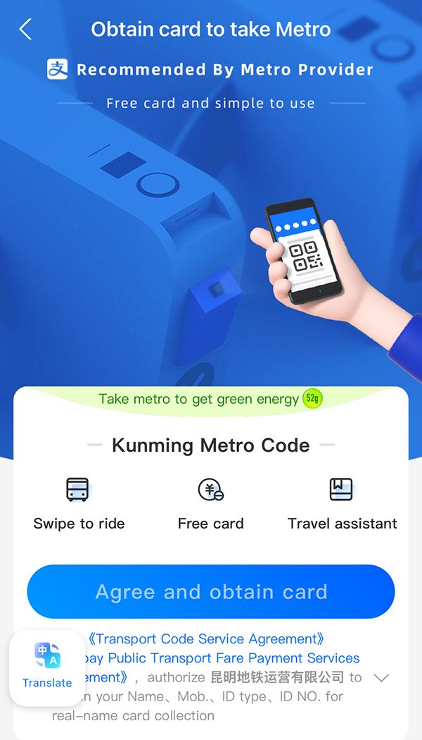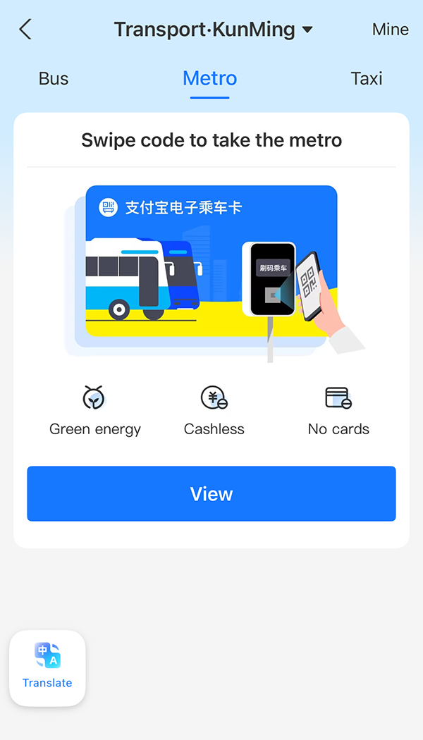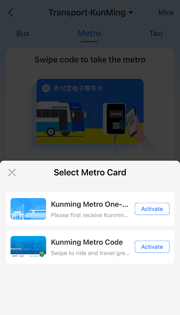 Les voyageurs qui souhaitent se déplacer à Kunming en utilisant les services de Kunming Rail Transit peuvent installer Alipay sur leur téléphone portable et activer la Metro Card sur l'application.
