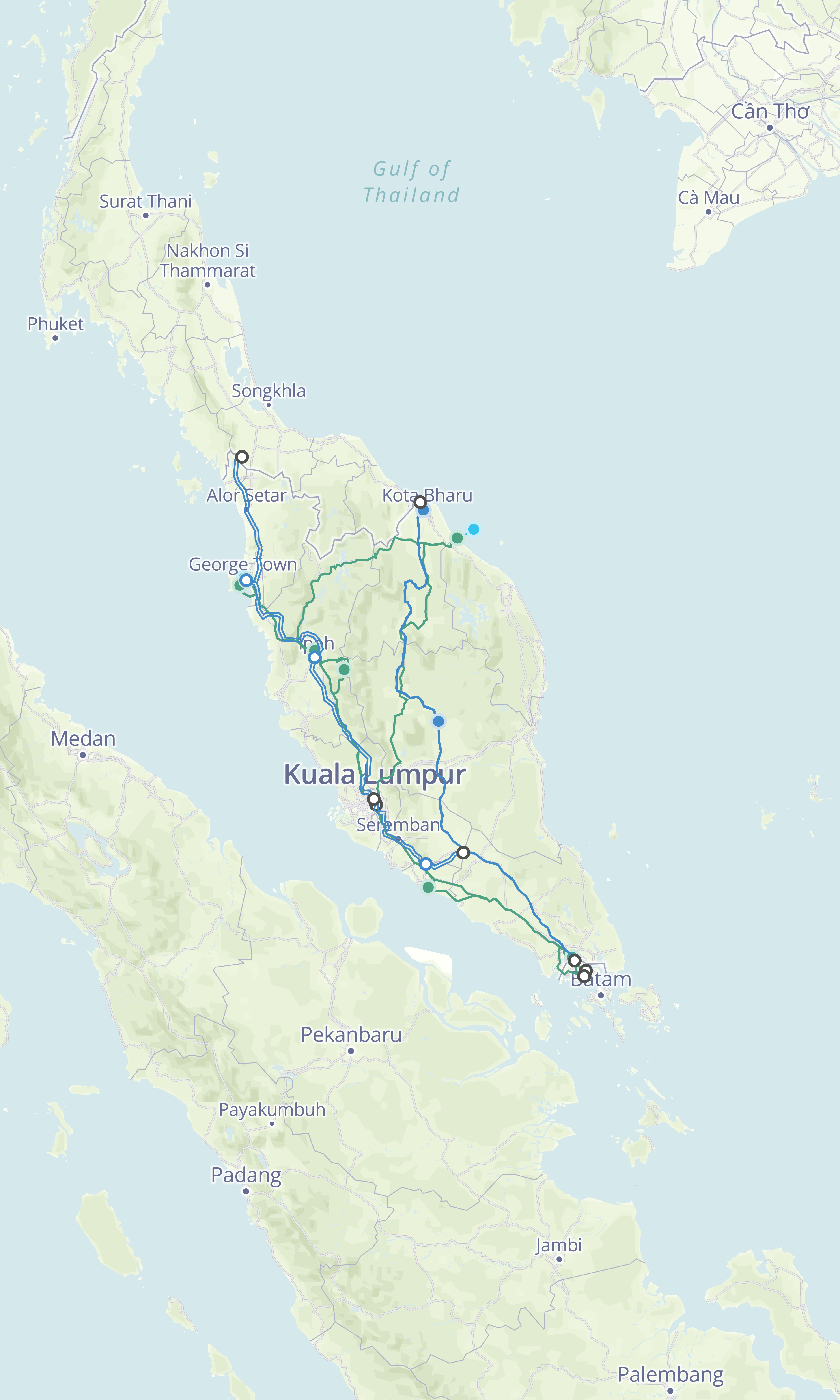 Băng Cốc, Surat Thani, Hat Yai và Padang Besar được kết nối bằng Tuyến SRT miền Nam khai thác bởi Đường sắt quốc gia Thái Lan (SRT).